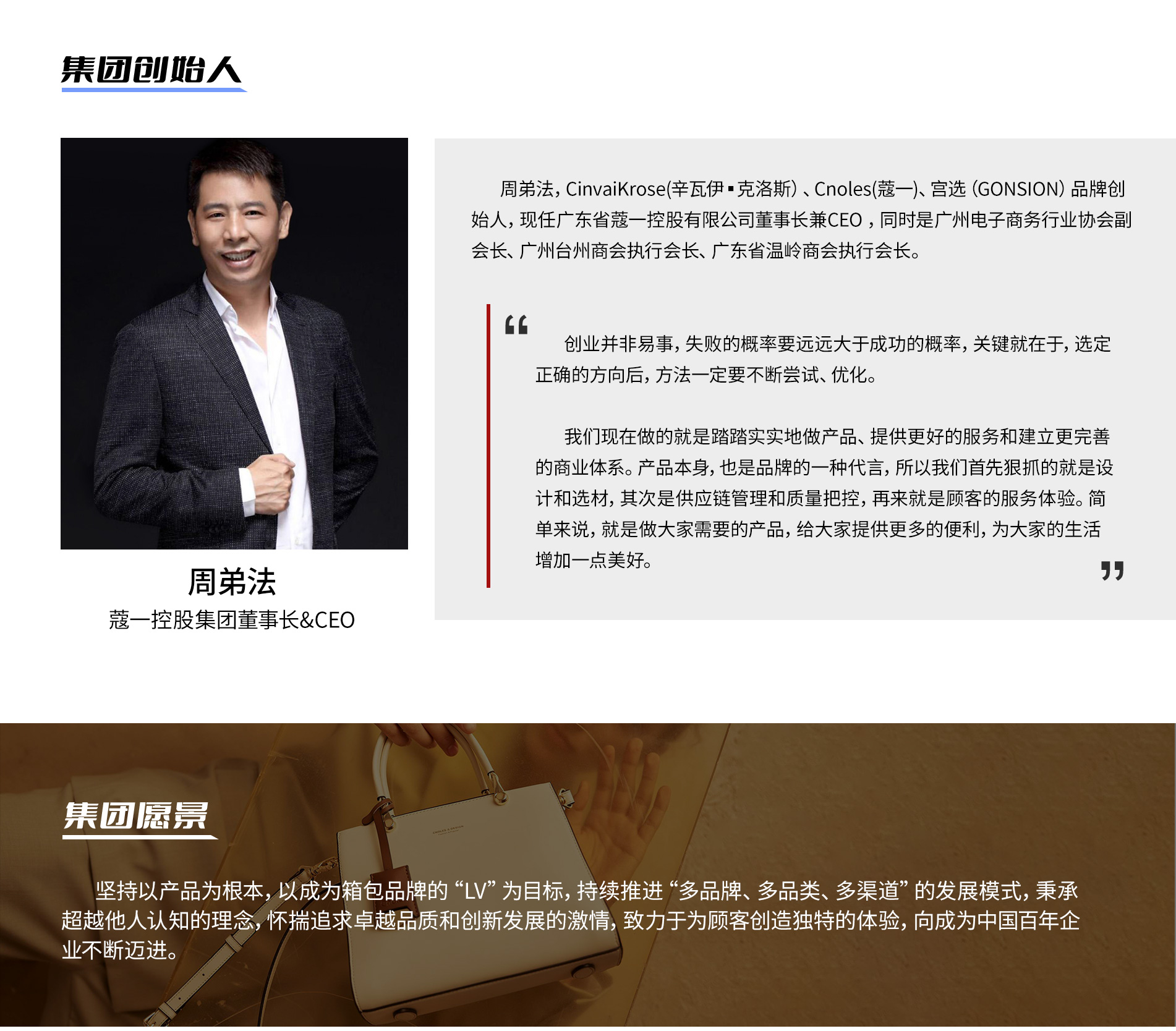 目前,集团旗下品牌有:CinvaiKrose(辛瓦伊▪克洛斯)、Cnoles(蔻一)、宫选(GONSION)等。